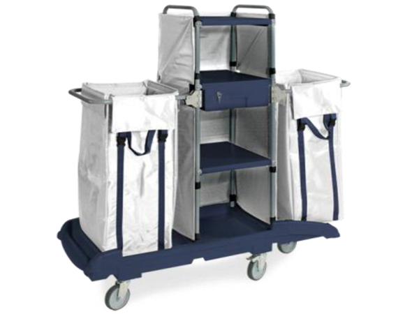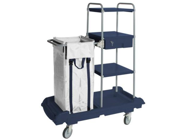 Base en plastique dur sur 4 roues Ø 125 (2 avec frein). Structure en acier revêtement rilsan, 3 étagères, 1 tiroir avec serrure, 1 sac nylon 150 lts. Dimensions chariot: 110x55x152 h / 20 Kg
