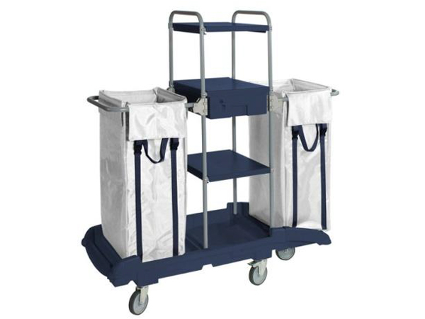 Base en plastique dur sur 4 roues Ø 125 (2 avec frein). Structure en acier revêtement rilsan, 3 étagères, 1 tiroir avec serrure, 2 sac nylon 150 lts. Dimensions chariot: 140x55x152 h / 24 Kg